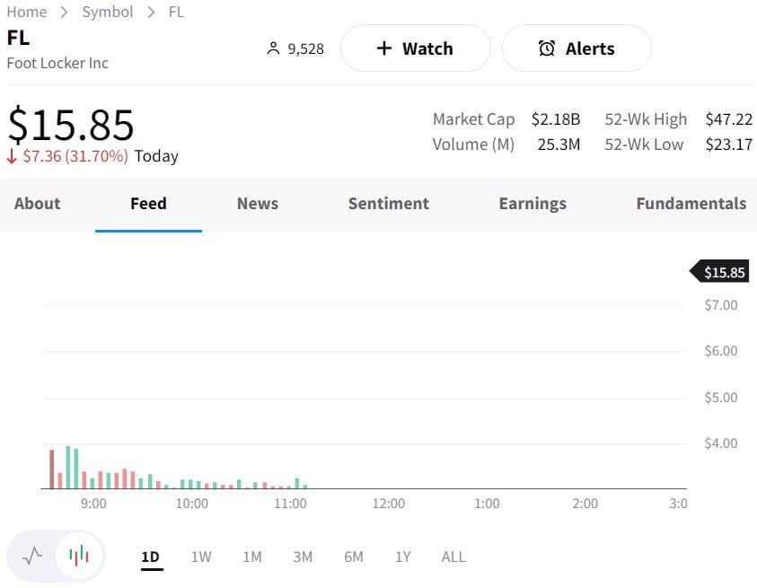 The company has subsequently reduced its full-year outlook. The news triggered a 25% drop in Foot Locker’s stock at the opening of Wednesday’s trading session. The company also reported a striking 96.4% decrease in non-GAAP earnings per share (EPS) down to 4 cents.