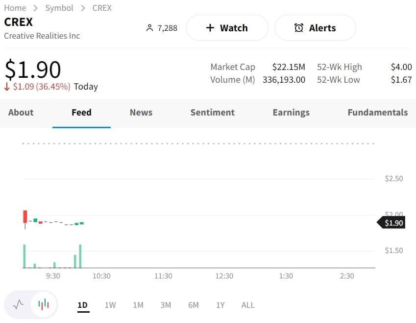 Shares of Creative Realities Inc. (NASDAQ: CREX) experienced a significant decline, shedding 36.45% after the pricing of its public offering was set at $2 per share. This saw the Louisville, Kentucky-based digital marketing firm’s stock fall to $2 in premarket trading, starkly contrasting their 72% year-to-date gain recorded at Wednesday’s market close.