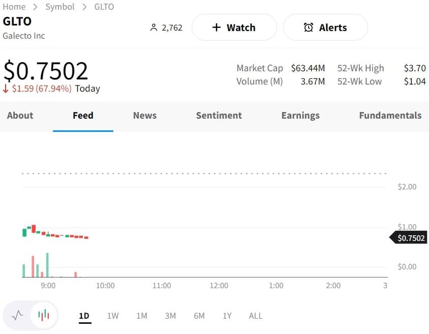 The announcement led to a significant 67.94% drop in Galecto’s shares, which opened at 77 cents. This is the first time the stock has fallen below the $1 mark since its listing in October 2020.
