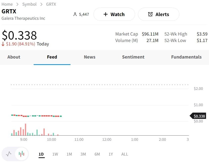 Galera Therapeutics Inc (NYSE: GRTX) shrank 82.6% after the US Food and Drug Administration (FDA) declined to approve its drug for treating severe mouth inflammation in patients with advanced head and neck cancer.
