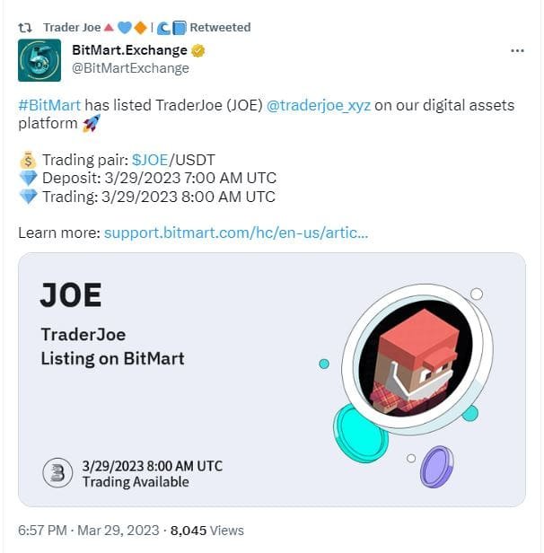 BitMart crypto exchange announced its intention to list JOE on March 29. The team further noted that deposits for the JOE/USDT trading pair became available at 7:00 am UTC that same day, while trading started at 8:00 am UTC, and withdrawals were activated at 9:00 am UTC.