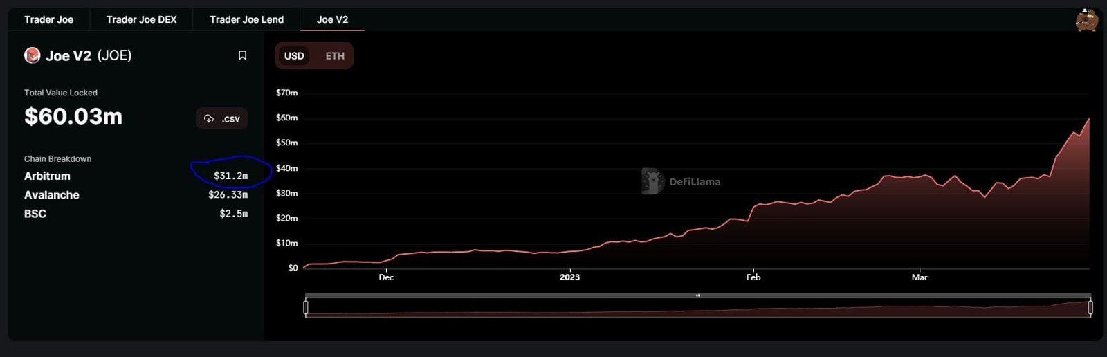 Furthermore, of the $60 million of locked value automated market maker Joe V2 brought to the table, over $31 million came from Arbitrum, as the chart below indicates.