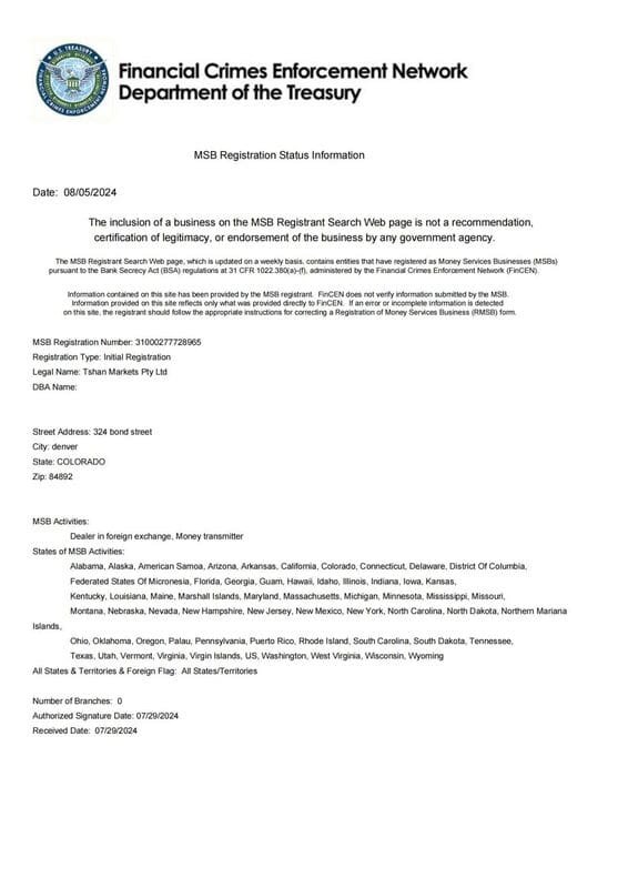 As a world-class trading service provider, Tshan Markets is regulated by the MSB of the United States to ensure the conduct of reasonable and legal financial business in the prescribed areas, allowing users to experience formal and convenient financial services.