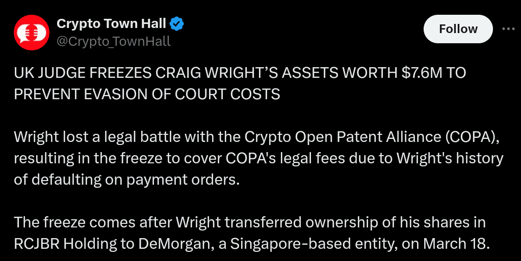 On March 14, Wright lost the high-profile case against COPA. The court documents reveal that the asset freeze is a precautionary measure, citing Wright’s “history of default in relation to orders for the payment of money.”