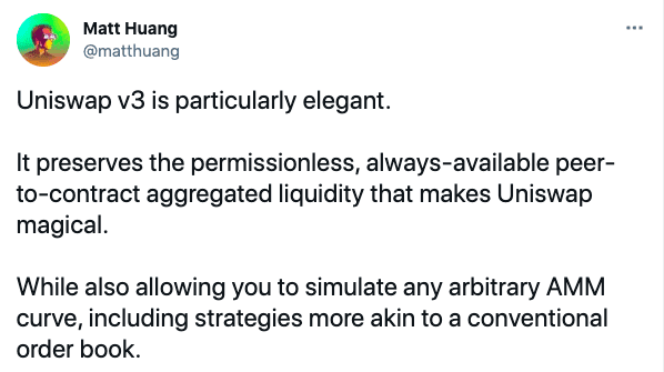 Paradigm co-founder Matt Huang seemed on board with the update, calling it ‘particularly elegant’ in a twitter post. “It preserves the permissionless, always-available peer-to-contract aggregated liquidity that makes Uniswap magical,” Huang noted. “While also allowing you to simulate any arbitrary AMM curve, including strategies more akin to a conventional order book.”