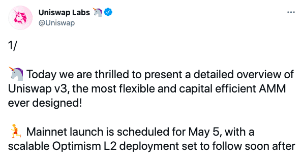 Long Beach (CoinChapter): Uniswap announced they are targeting an L1 Ethereum mainnet launch for its V3 update on May 5. An L2 deployment on Optimism set to follow shortly after.