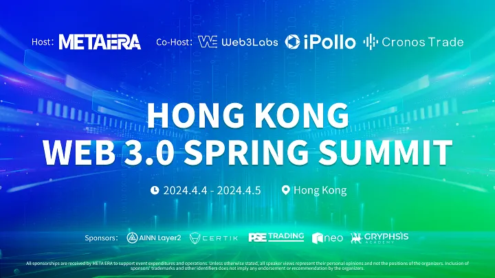 The Hong Kong Web3.0 Spring Summit, jointly hosted by MetaEra, Web3 Labs, Ipollo, and Cronos Trade and sponsored by AINN Layer 2, CertiK, PSE Trading, Neo, and Gryphsis Academy, is set to have a grand opening from April 4th to 5th, 2024.