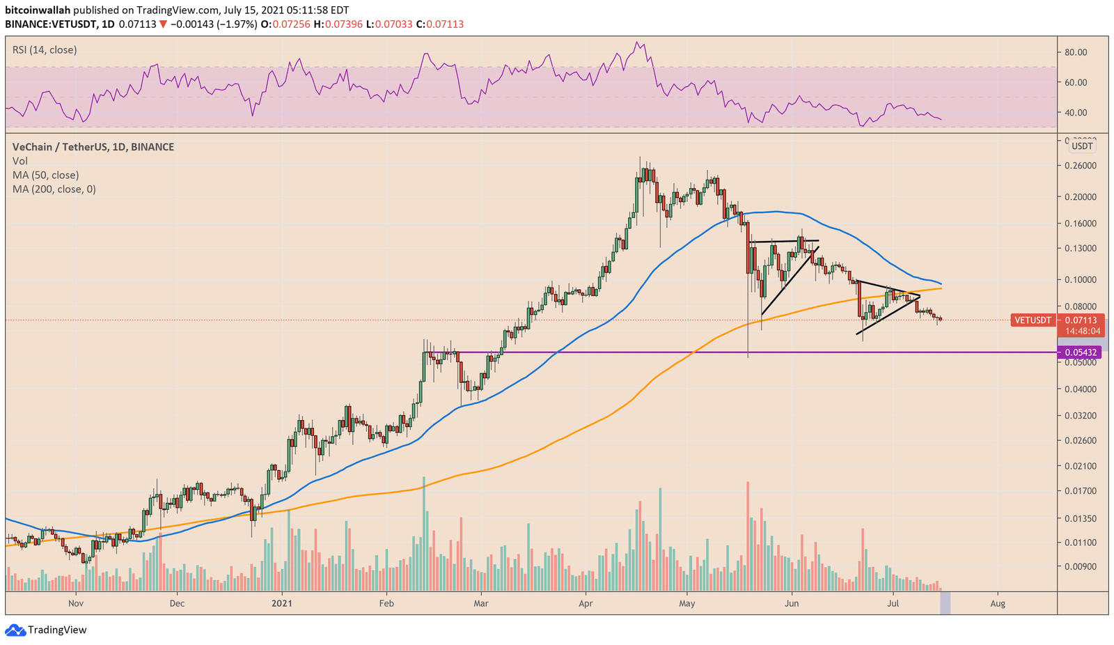 A combination of triangle formations (bearish ascending and symmetrical), one printed just after the May 19 crash and the other precisely a month later (after June 20), has limited all recovery options for VET. After the first triangle breakout, VETUSDT spot rates declined by 60% ($0.152 to $0.06). The drawdown was approximately equal to the length of the triangle’s side parallel to chart candles.