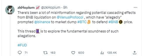 The FUD began with a potential liquidation scare related to a prior Binance Chain exploit (in Oct 2022) involving the Venus Protocol.