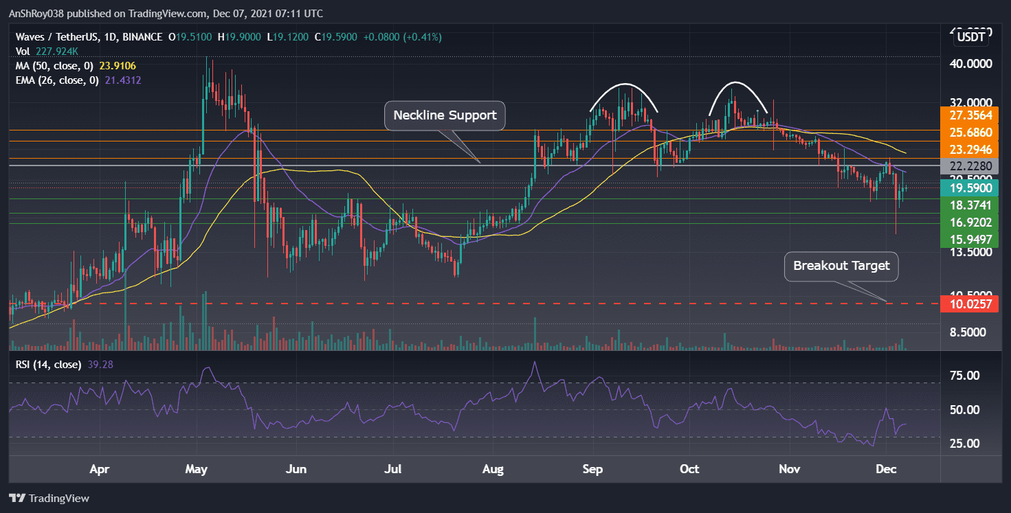 At the time of writing, WAVES was trading at $19.57, up 1.66% on the day. On Monday, the token swung wildly, falling over 16% high ($21) to low ($18) before recovering.