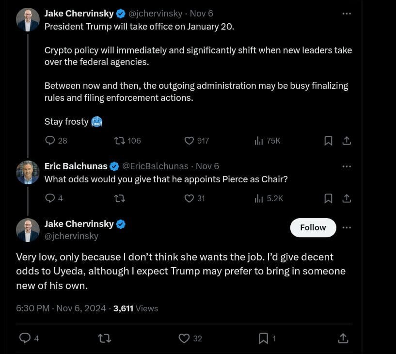 His opposition to strict enforcement aligns with the pro-crypto stance that Trump’s administration might pursue. Uyeda’s internal familiarity with the SEC’s workings and his stance against enforcement-driven regulation make him a viable candidate.
