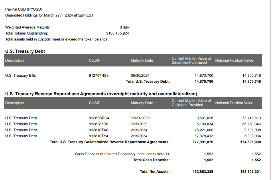 Furthermore, the report reveals that the current market value of the PYUSD collateral held in U.S. Treasury bond-collateralized reverse repurchase agreements is $177.9 million, with a notional position value of around $174 million. The total net assets of the PYUSD stablecoin amounted to $192 million, with a notional position value of $189 million.