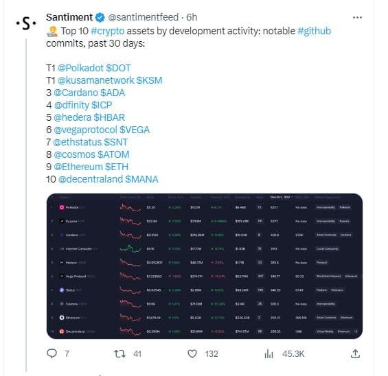 However, the blockchain still ranked #3 among crypto assets with the highest developer activity. According to on-chain data tracker Santiment, Cardano came third after Polkadot (DOT) and Kusama (KSM) by the number of commits on GitHub.