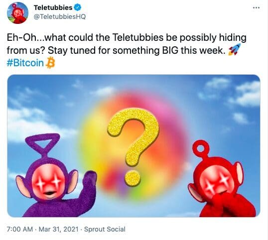 The post said, “Eh-Oh…what could the Teletubbies be possibly hiding from us? Stay tuned for something BIG this week.” This was followed by the rocketship emoji and a Bitcoin hashtag. Additionally two of its characters, Tinky Winky and Po, appear next to a question mark with laser eyes.
