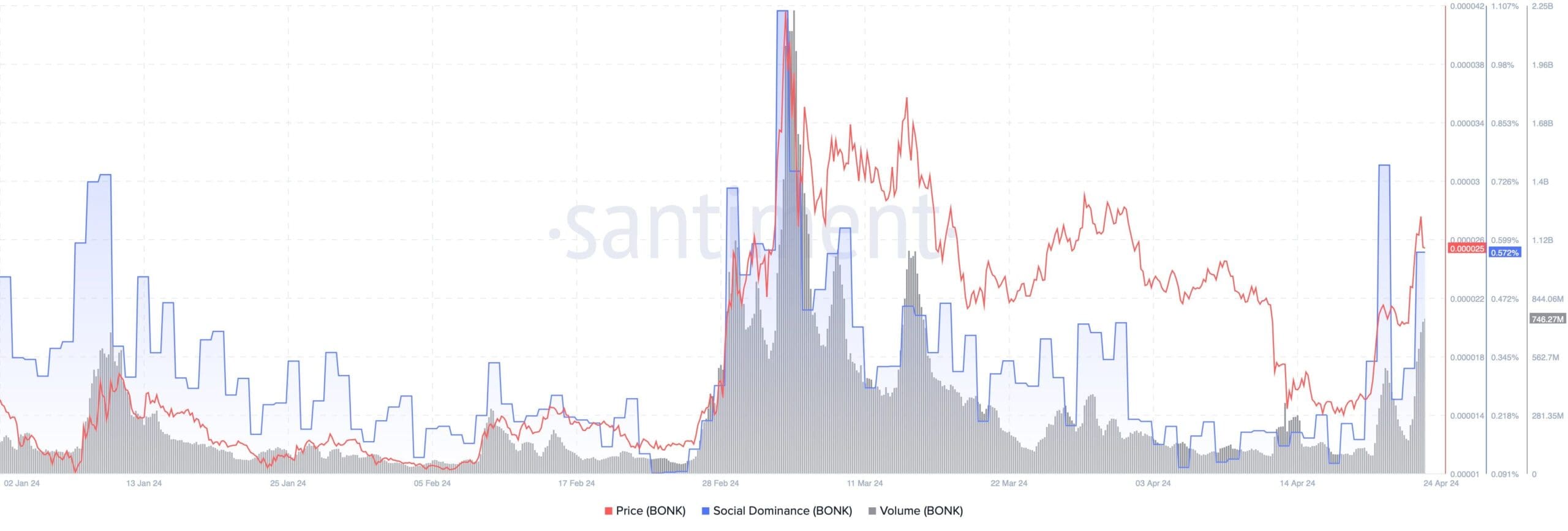 The spike in Bonk’s social dominance reflects its growing popularity and investor interest. Despite a recent market correction, the volume and social media activity surrounding Bonk remain high, suggesting that the community support is strong. This social momentum can often precede further price increases as it attracts more attention to the coin.